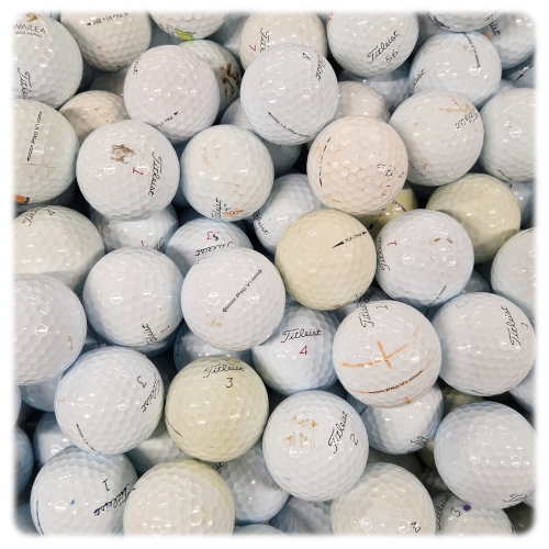 Zeer goedkope oefenballen/cross-ballen in grootverpakking. Versleten ballen met krasjes, verkleuringen, vuil en beschadigingen. Perfect voor training, cross-golf of om weg te slaan.